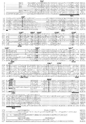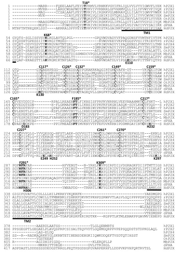 Figure 1. Amino acid alignment of HdP2X. The predicted amino acid sequence of HdP2X was aligned with human P2X1, and 4, rat P2X2 and non vertebrate P2X channels from S. mansoni (smP2X) [12]O. tauri (OtP2X) [11], M. brevicollis (MbP2X) [11] and D. discoideum (dP2XA) [10]. Predicted transmembrane regions in HdP2X (TopPred algorithm [19]) are depicted by black horizontal lines. Functionally important amino acid residues using human P2X1 residue numbering (indicated by *) are highlighted in bold above the sequence including positively charged lysine residues, FT and NFR motifs, conserved cysteines and a conserved consensus protein kinase C phosphorylation site. Point mutations made in HdP2X to investigate zinc and copper binding are indicated in bold below the sequence.