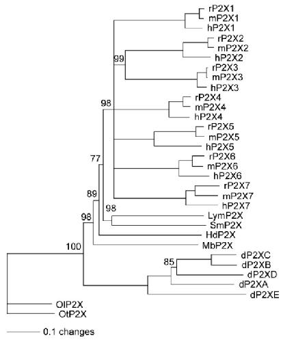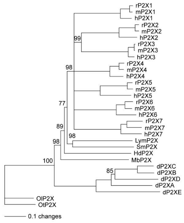 Figure 2. Phylogenetic relationships of Hypsibius dujardini P2X. Aligned protein sequences from P2X homologues from H. dujardini (Hd) (Tardigrada), vertebrates (represented by human (h), mouse (m) and rat (r); these taxa have seven paralogous P2X genes (P2X1â7)), S. mansoni (Sm) (Platyhelminthes), L. stagnalis (Lym) (Mollusca), M. brevicollis (Mb) (Choanoflagellida), D. discoideum (d) (Mycetozoa; Dictyosteliida; five paralogues) and two Ostreococcus species, O. tauri (Ot) and O. lucimarinus (Ol) (Chlorophyta; Prasinophyceae) were analysed using Neighbour Joining and maximum parsimony methods. Both methods agreed on the well supported nodes figured in this phylogram. Nodes were supported with bootstraps of 100% unless otherwise indicated; all nodes with less than 75% bootstrap support were collapsed.