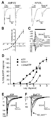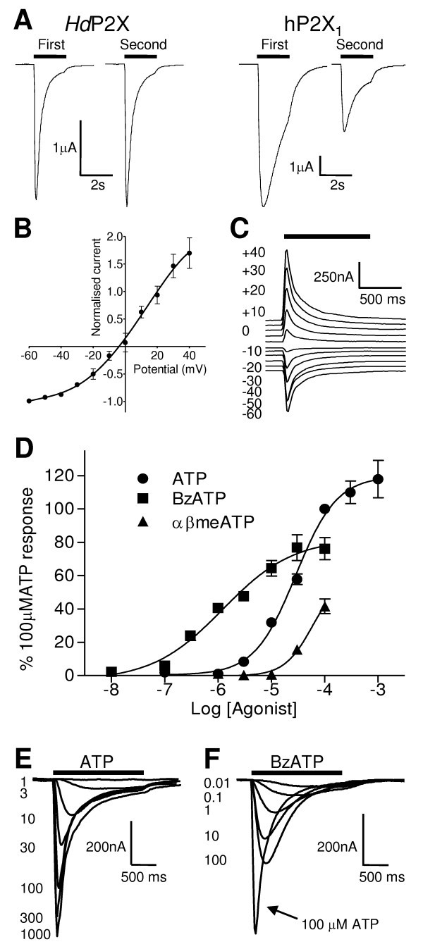 Figure 3. Properties of ATP evoked currents. Two-electrode voltage clamp recordings at a holding membrane potential of -60 mV were made from oocytes expressing HdP2X. A. Comparison of HdP2X and human P2X1 receptors. Currents were recorded in response to 100 μM ATP, indicated by bar. HdP2X displays faster current rise and decay times than the human P2X1 and displays faster recovery from desensitisation between the first and second applications of agonist (applications 5 minutes apart). B. Current voltage relationship of HdP2X. The reversal potential of ATP mediated currents was determined by recording ATP (100 μM, indicated by bar) induced currents at holding potentials ranging from -100 mV to +40 mV with a 5 minute interval between applications. Currents obtained in different oocytes were normalised to the current obtained at -60 mV for each individual cell (n = 6). C. Example currents for the plot depicted in B. D. Concentration response curves for ATP, Bz-ATP and αβ-me-ATP. Mean currents were normalised to the response given by 100 μM ATP (n = 5–7). E and F. Example currents recorded in response to ATP (E) and Bz-ATP (F) (concentrations in μM, agonist application indicated by bar).