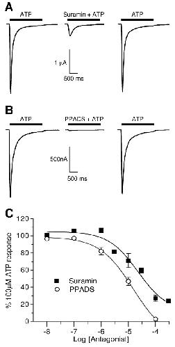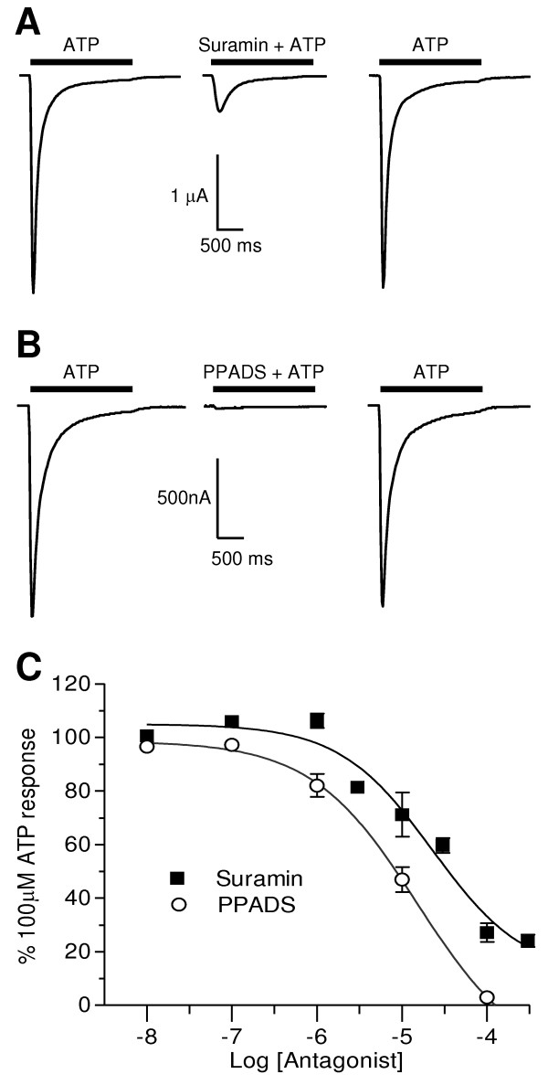 Figure 4. HdP2X is antagonised by suramin and PPADS. The effects of the P2 receptor antagonists suramin and PPADS were determined in Xenopus oocytes expressing HdP2X at a holding membrane potential of -60 mV. A. Example currents in response to 100 μM ATP in the presence and absence of 100 μM suramin (five minutes between sequential applications). B. Example currents in response to 100 μM ATP in the presence and absence of 100 μM PPADS (five minutes between sequential applications). C. Inhibition curves for mean responses to 100 μM ATP in the presence of suramin (closed squares) (n = 5) and PPADS (open circles) (n = 5).