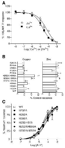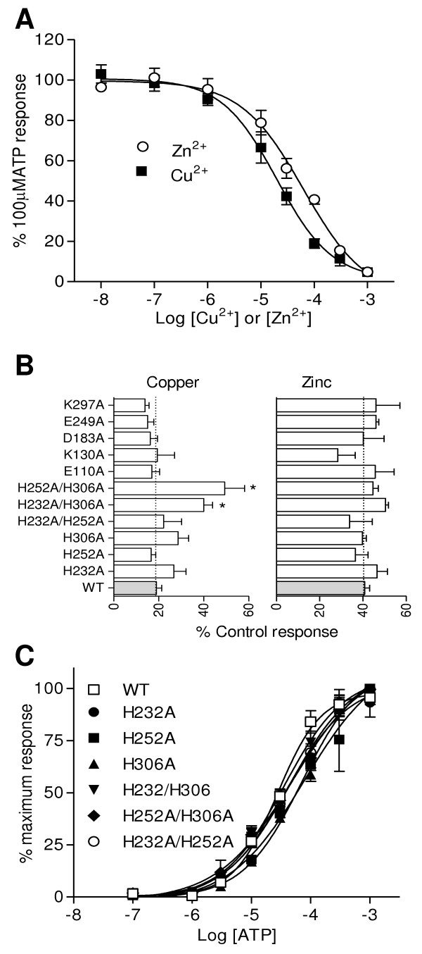 Figure 5. HdP2X receptor currents are inhibited by zinc and copper. Two-electrode voltage clamp recordings were made from Xenopus oocytes expressing HdP2X at a holding potential of -60 mV. A. Concentration response curves for 100 μM ATP (~EC80) in the presence of varying concentrations of zinc (open circles) (n = 6) and copper (closed squares) (n = 6). B. Effects of single and double point mutations on inhibition by 100 μM zinc and copper. Mean currents are normalised to the 100 μM ATP response in the absence of zinc or copper for wild type and mutant receptors (n = 7). C. ATP concentration response curves for histidine point mutations (n = 7). For each single and double histidine mutation no significant change in ATP sensitivity was observed suggesting that mutation had not resulted in gross changes in receptor conformation. The triple histidine mutation H232A/H252A/H306A produced a non functional channel and so could not be studied.
