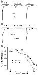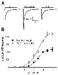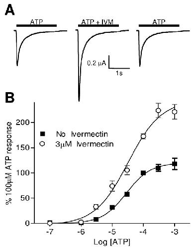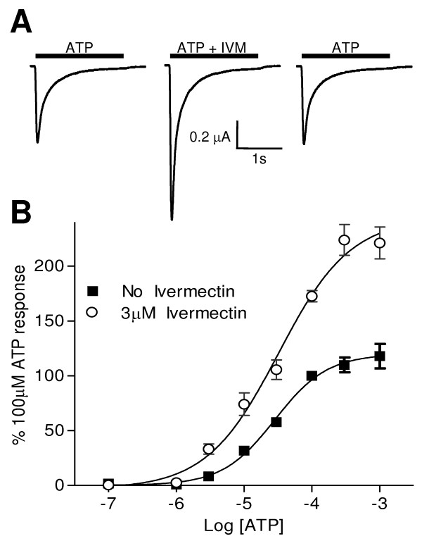 Figure 6. Ivermectin potentiates ATP evoked currents at HdP2X. Two-electrode voltage clamp recordings were made from Xenopus oocytes expressing HdP2X. A. Representative ATP (100 μM) evoked currents recorded from the same cell in the presence and absence of 3 μM ivermectin (ATP/ivermectin application indicated by bars). Five minutes recovery was allowed between applications and ivermectin was bath perfused at 3 μM in the five minutes preceding the second recording as well as being present in the ATP application. B. Concentration response curves for ATP in the presence (open circles) and absence (closed squares) of 3 μM ivermectin (n = 7). Mean currents were normalised to the response produced by 100 μM ATP in the absence of ivermectin.