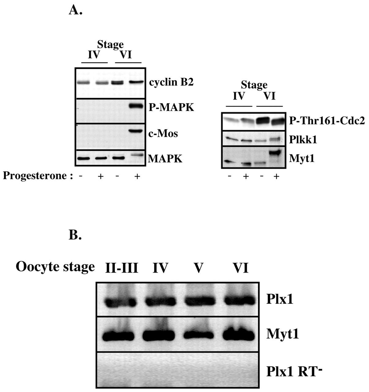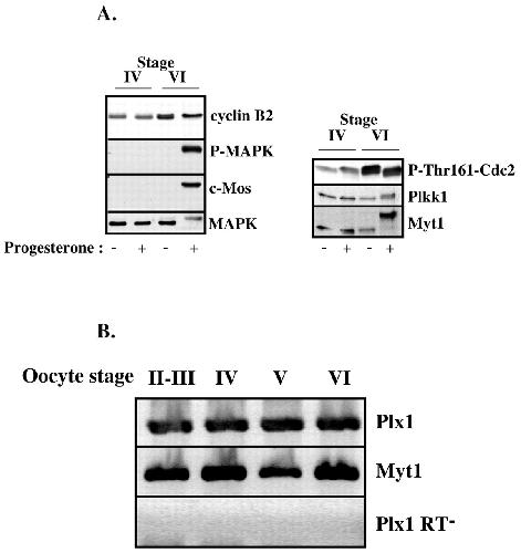 Expression of the regulators of Cdc2 activation during oogenesis. (A) Prophase oocytes at stage IV (750-800 μm), stage V (900-11,000 μm) and stage VI (â¥1200 μm) were incubated or not in the presence of progesterone and collected 18 hours afterwards. Oocyte extracts were western blotted with antibodies against cyclin B2, the active phosphorylated form of MAPK (P-MAPK), Mos, MAPK, the Thr161-phosphorylated form of Cdc2 (P-Thr161-Cdc2), Plkk1 and Myt1. (B) RT-PCR analysis of Plx1 transcripts. Total RNA of oocytes at various stages was subjected to RT-PCR analysis using Plx1 or Myt1 oligonucleotides as primers. Myt1 was used as the loading control. Without reverse transcription (Plx1 RT-), no amplification products were detectable using Plx1 primers.