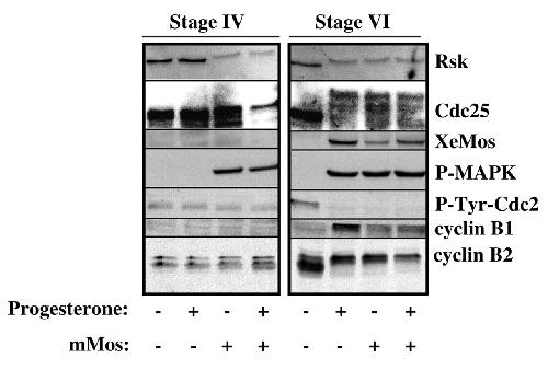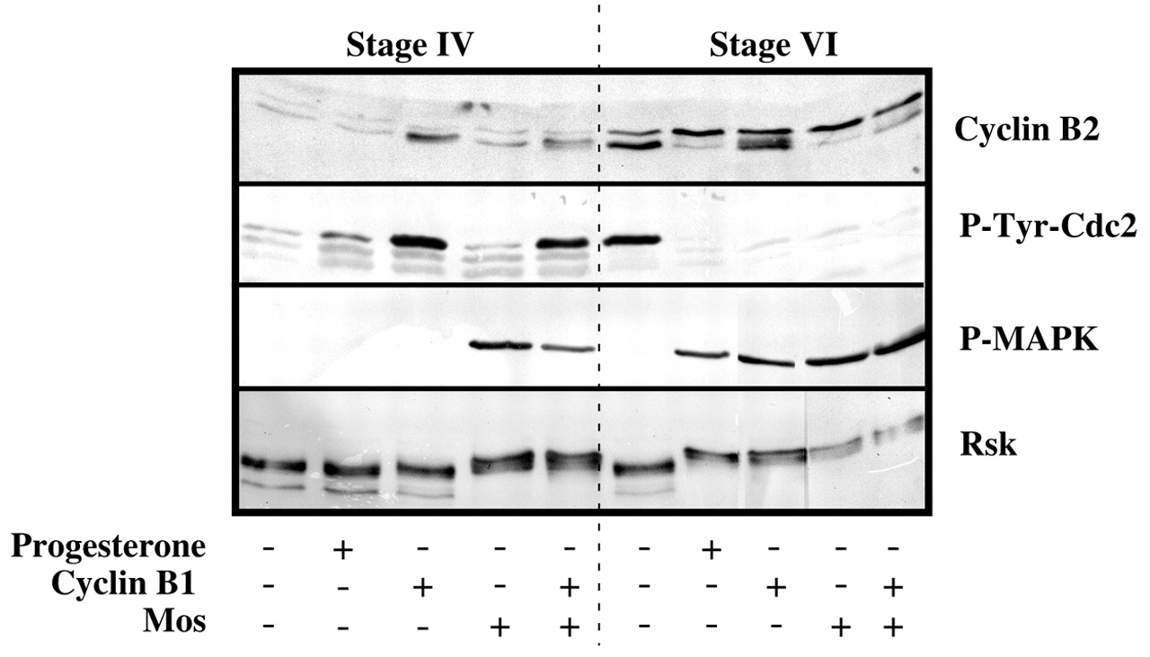 Stage IV and stage VI oocytes were stimulated by progesterone or injected with either GST-cyclin B or Xenopus Mos protein or both GST-cyclin B and Mos. Oocytes were collected and western blotted with antibodies against cyclin B2, the Tyr15-phosphorylated form of Cdc2 (P-Tyr-Cdc2), the active phosphorylated form of MAPK (P-MAPK) and Rsk.