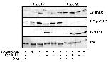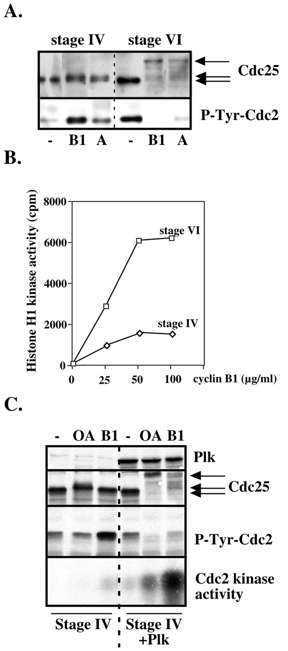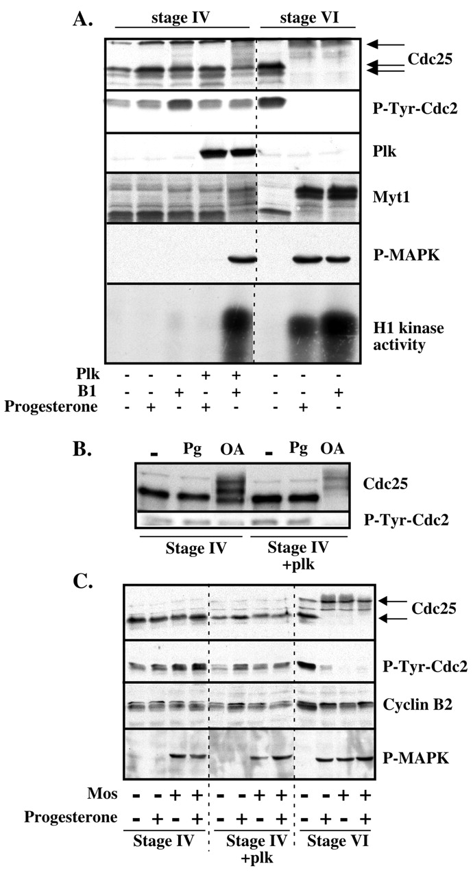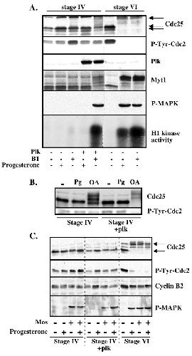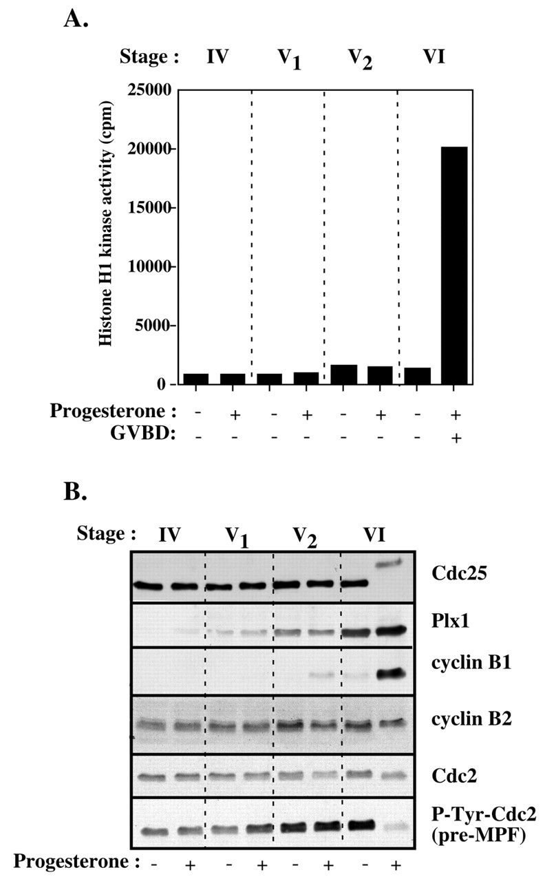 Expression of the regulators of Cdc2 activation in stage IV oocytes. Prophase oocytes at stage IV (750-800 μm), stage V1 (900-1000μ m), stage V2 (1000-1100 μm) and stage VI (â¥1200 μm) were incubated or not in the presence of progesterone and collected 18 hours afterwards. Occurrence of GVBD is indicated by (+). Oocyte extracts were either assayed for H1 kinase activity of Cdc2 (A) or western blotted (B) with antibodies against Cdc2, cyclin B1, cyclin B2, Cdc25, Plx1 and the Tyr15-phosphorylated form of Cdc2 (P-Tyr-Cdc2).