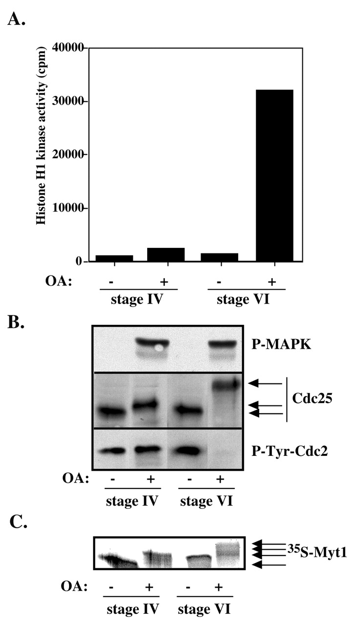 Okadaic acid is unable to induce MPF auto-amplification in stage IV oocyte extracts. Stage IV and stage VI oocyte extracts were incubated in the presence (+) or in the absence (â) of 1 μM okadaic acid (OA) and an ATP-regenerating system for 3 hours. (A) Histone H1 kinase assay of Cdc2. (B) Western blots revealed with antibodies against the active phosphorylated form of MAPK (P-MAPK), Cdc25 and the Tyr15-phosphorylated form of Cdc2 (P-Tyr-Cdc2). (C) Oocyte extracts were supplemented with [35S]methionine labeled Myt1 at time of OA addition. Extracts were then submitted to SDS-PAGE and to autoradiography.