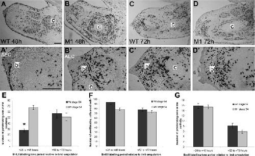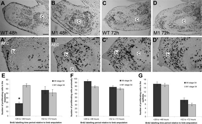 Figure 5. Cell proliferation analysis in M1 and wild-type (WT) hindlimbs after amputation. Tadpoles were injected with 5â²-bromo-2â²-deoxyuridine (BrdU) either 28 or 52 hr after amputation of the righthindlimb at stage 54, and fixed 20 hr later. Cells that have incorporated BrdU during cell divisions have darkly stained nuclei. AâD: Representative sections showing the pattern of BrdU accumulation along the whole limb. Aâ²âDâ²: Higher magnification of the distal tip of the limb showing the apical epithelial cap (AEC) and blastema (bl). EâG: Bar graphs showing the number of BrdU-labeled cells in a 200 à 200 μm area for mesenchyme or a 200 μm length along the distal tip. Bars show the average of 3 counts for each of 3 representative limbs (except n = 2 limbs for M1 72 h) and error bars are standard error. E: Proliferating cells in the blastema/distallimb; an asterisk indicates a significant difference (P = 0.047) between the number of proliferating cells in WT and M1 limbs at the earlier time point. F: Proliferating cells in the proximallimb. G: Proliferating cells in the epithelia/AEC. Scale bar = 200 μm in A (applies to AâD), 200 μm in Aâ² (applies to Aâ²âDâ²).
