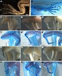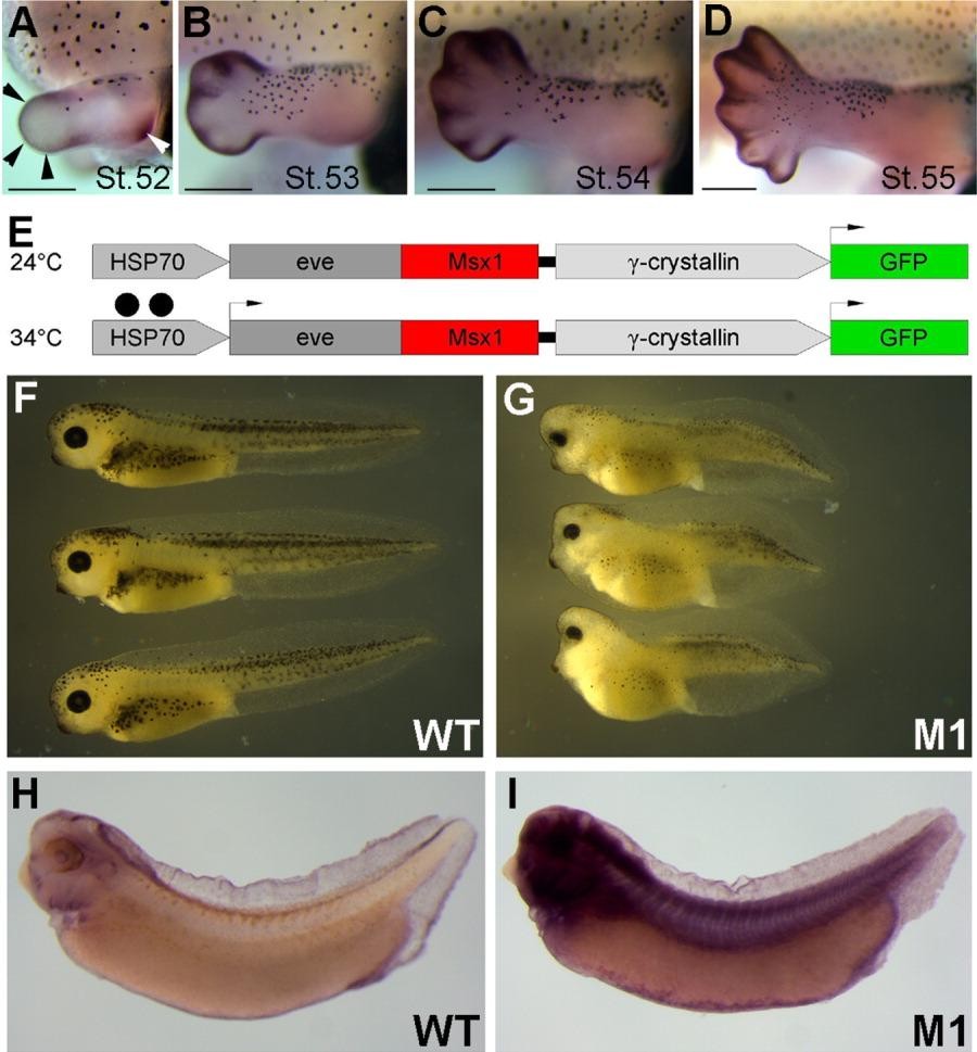 Figure 1. Development of the M1 transgenic line of Xenopus laevis. A-D: Endogenous expression of Msx1 in Xenopus hindlimbs from stage 52 to 55. Scale bars = 250 mu m, and limbs are oriented with distal to the left and posterior uppermost. Expression is restricted to the distalmesenchyme and excluded from the apical epidermal ridge (AER; black arrowheads in A). There is also an early proximal-anterior located expression (white arrowhead, A). Later expression is interdigital. E: Schematic representation of the eveMsx1 transgene. At 24 or below, the transgene is silent. At 34, however, heat shock factors (black circles) bind to the hsp70 promoter sequence and activate transcription of eveMsx1. The construct is fused to a second transgene containing the gamma -crystallin promoter driving green fluorescent protein (GFP). F,G: Phenotypes of tadpoles following heat shock at stage 14. WT embryos develop normally and are unaffected by the heat shock (F). Transgenic tadpoles have a flattened anteriorhead, reduced eye size, reduced number of melanocytes (pigment cells), and a shortened tail (G). H,I: In situ hybridization using an Msx1 probe to show the normal expression of Msx1 (H) is expanded and up-regulated in heat shocked transgenic animals (I).