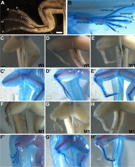 Figure 2. Regeneration phenotypes in stage 54 amputated Xenopus wild-type (WT) or M1 limbs. A,B: M1 unoperated (left) contralateral limbs. A: Dorsal view of unoperated limb of stage 57 M1 tadpole and B ventral view of skeletal preparation showing the limb elements present at stage 57. CâH: ventral view of operated (right) limb following amputation at knee level at stage 54, heat shocked and fixed at stage 57. Câ²âHâ²: Skeletal preparations of the corresponding tadpoles. Alcian blue stains the cartilage and alizarin red the ossified bonetissue. C,Câ²: WT limb in which no regeneration has taken place and a stump is formed ending at the knee. D,Dâ²: WT limb that has regenerated two toes and has no tibiaâfibula and an abnormal metatarsal. E,Eâ²: WT limb that has regenerated a tibiaâfibula, abnormal metatarsal, one normal toe, and a vestigial distal phalange (counted as two toes). F,Fâ²: M1 limb that regenerated four toes but lacks a tibiaâfibula. G,Gâ² M1 limb that regenerated an abnormal metatarsal and tibiaâfibula as well as three toes. H,Hâ²: M1 limb with regenerated tibiaâfibula, abnormal metatarsal and a single toe. A vestigial proximal phalange is also present (counted as 1 toe).