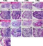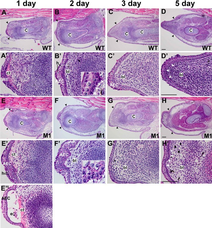 Figure 4. Histological analysis of M1 and wild-type (WT) partially amputated hindlimbs. AâD: Sections of WT limbs showing the whole limb after 1â5 days of regeneration following stage 54 knee level amputation. Aâ²âDâ²: Higher magnification of the distal tip in sections AâD, respectively. EâH: Sections of M1 limbs showing the whole limb after 1â5 days of regeneration. Eâ²âHâ²: Higher magnification of the distal tip of sections EâH, respectively. Eâ² shows a 1 day postamputation M1 limbdistal tip in which the apical epithelial cap (AEC) has detached from the underlying mesenchyme creating a gap containing connective tissue and presumptive eosinophils. c, cartilage; ct, connective tissue; bl, blastema; e, eosinophils; WE, wound epithelium; h, hypertrophic cells. Black arrowheads in AâH indicate the approximate level of amputation. White arrowheads in Dâ², Hâ² indicate the eosin stained basement membrane. Insets in Bâ², Fâ² correspond to white box and arrows mark columnar-like cells. Tadpoles are oriented with dorsal side uppermost, and anterior to the right. Limbs are, therefore, distal to the left, posterior uppermost. Scale bars = 100 μm in D,H (applies to AâH), 100 μm in Dâ²,Hâ² (applies to Aâ²âHâ²,Eâ²).
