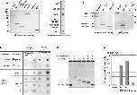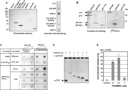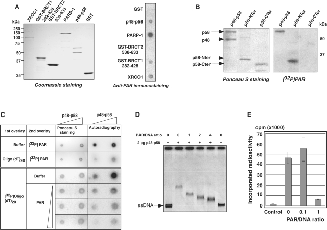 Figure 3. The p58 subunit of DNA primase binds to PAR leading to its inactivation. (A) The indicated purified proteins (1 μg each) were dot-blotted onto nitrocellulose and incubated with PAR. Bound PAR was immunodetected with anti-PAR antibody. Loading of proteins was quantified on a Coomassie stained SDS–PAGE. (B) The indicated purified proteins (2 μg) were separated on SDS–PAGE, transfered on nitrocellulose membranes and incubated with 32P-labeled PAR. Visualization of the loaded proteins was performed by Ponceau S staining of the membrane. (C) Increasing amounts of purified p48–p58 (1 and 2 μg) were dot blotted on nitrocellulose membrane and a first overlay (buffer, radioactively labeled or unlabeled oligo(dT)20, as indicated) was followed by a second incubation (radioactively labeled or unlabeled PAR or buffer) to analyze the competition between PAR and DNA for p58 binding. (D) Band shift assay to analyze complex formation of p48–p58 and ssDNA (ssDNA: PhiX174 single-stranded DNA). Two micrograms of purified p48–p58 was incubated with ssDNA (70 ng) and PAR was added in increasing concentration to displace the p48–p58–ssDNA complex. PAR to DNA ratio varied from 0 to 1–4 excess of PAR. (E) Addition of increasing amounts of PAR to primase assay (ratio 0, 1:10, 1:1) significantly inhibited primase activity.