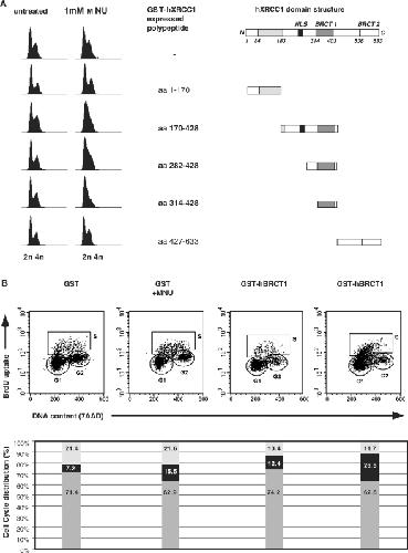 Figure 5. GST-hXRCC1-BRCT1 overexpressing cells accumulate in S phase following DNA damage. (A) Cell cycle analysis (right) of HeLa cells overexpressing GST-tagged fragments of hXRCC1 (schematically represented on the right), treated by 1 mM MNU and analyzed 20 h after. (B) Flow cytometry profiles of BrdU incorporation (DNA synthesis) versus DNA content (7AAD fluorescence) of HeLa cells overexpressing either GST alone or GST-hXRCC1-BRCT1 20 h after treatment or not with 1 mM MNU.