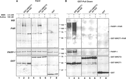 Figure 4. GST-XRCC1-BRCT1 overexpressed in HeLa cells triggers PAR synthesis and is poly(ADPribosyl)ated. HeLa cells overexpressing GST-hXRCC1-BRCT1 (amino acids 282–428, lanes 1–3), GST-hXRCC1-BRCT2 (amino acids 427–633, lanes 4–6) or GST (lanes 7, 8) were either untreated (lanes 1, 4 and 7) or treated with 2.5 mM MMS for 30 min (lanes 2, 5 and 8). Where indicated, cells were pre-incubated for 2 h with 100 nM of the PARP inhibitor Ku-0058948 (lanes 3 and 6). (A) Inputs corresponding to 2% of each lysates. Proteins were analyzed by GST pull down and western blot (B) using successively the anti-PAR, anti-PARP-1 and anti-GST antibodies.