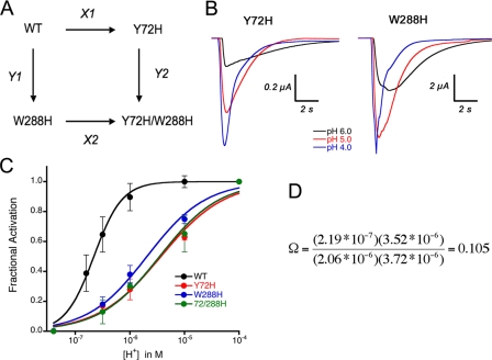 FIGURE 3. Double mutant cycle analysis of rASIC1 His mutants in positions 72 and
