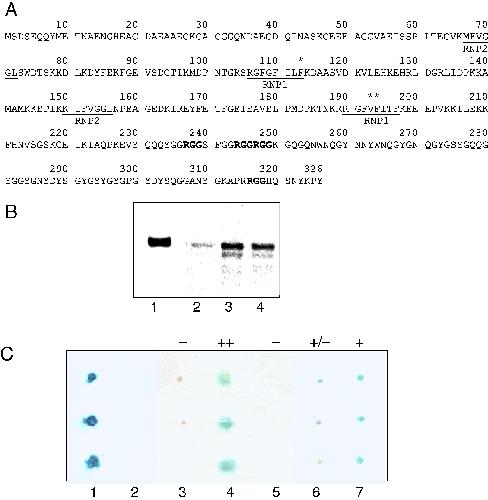 Prrp interacts with 40LoVe. (A) The predicted amino acid sequence of a 40LoVe paralog identified in the yeast two-hybrid screen. RNP1 and RNP2 motifs within the RNP domains are underlined. The individual RGG motifs are shown in bold. The phenylalanine at position 113 (*) marks the first amino acid present in the longest partial clone of 40LoVe retrieved from the two-hybrid screen. The valine at position 193 (**) is the first amino acid present in the shortest partial clone. The entire nucleotide sequence, including flanking UTRs, can be found at DDBJ/EMBL/GenBank Accession No. EU003449. (B) Co-precipitation of Prrp and 40LoVe. 40LoVe fused to maltose binding protein was synthesized in E. coli S30 extract and [35S]-labeled Prrp in rabbit reticulocyte lysate. After incubation for 4 h at 4 °C, amylose beads were pelleted, washed, and analyzed by SDSâPAGE/autoradiography. Lane 1, input Prrp; lane 2, amylose beads incubated with Prrp only; lane 3, beads incubated with Prrp and MBP-40LoVe; lane 4, beads incubated with Prrp, MBP-40LoVe and (1 μg) VLE RNA. (C) Colony lift filter assays used to characterize interactions between Prrp and 40LoVe. Each column represents three independently selected colonies. 1, positive control (p53/T antigen); 2, negative control (LamC/T antigen); 3, Prrp and full-length 40LoVe; 4, Prrp and 40LoVeδN (amino acids 113â326); 5, proline rich domain of Prrp (amino acids 242â360) and 40LoVeδN; 6, the RNA-binding domain of Prrp (aa 1â251) and full-length 40LoVe; 7, the RNA-binding domain of Prrp and 40LoVeδN. The apparent strengths of the interactions are labeled above the columns, and were scored as: âââ no interaction; â±â weak interaction; â+â interaction; and â++â strong interaction.