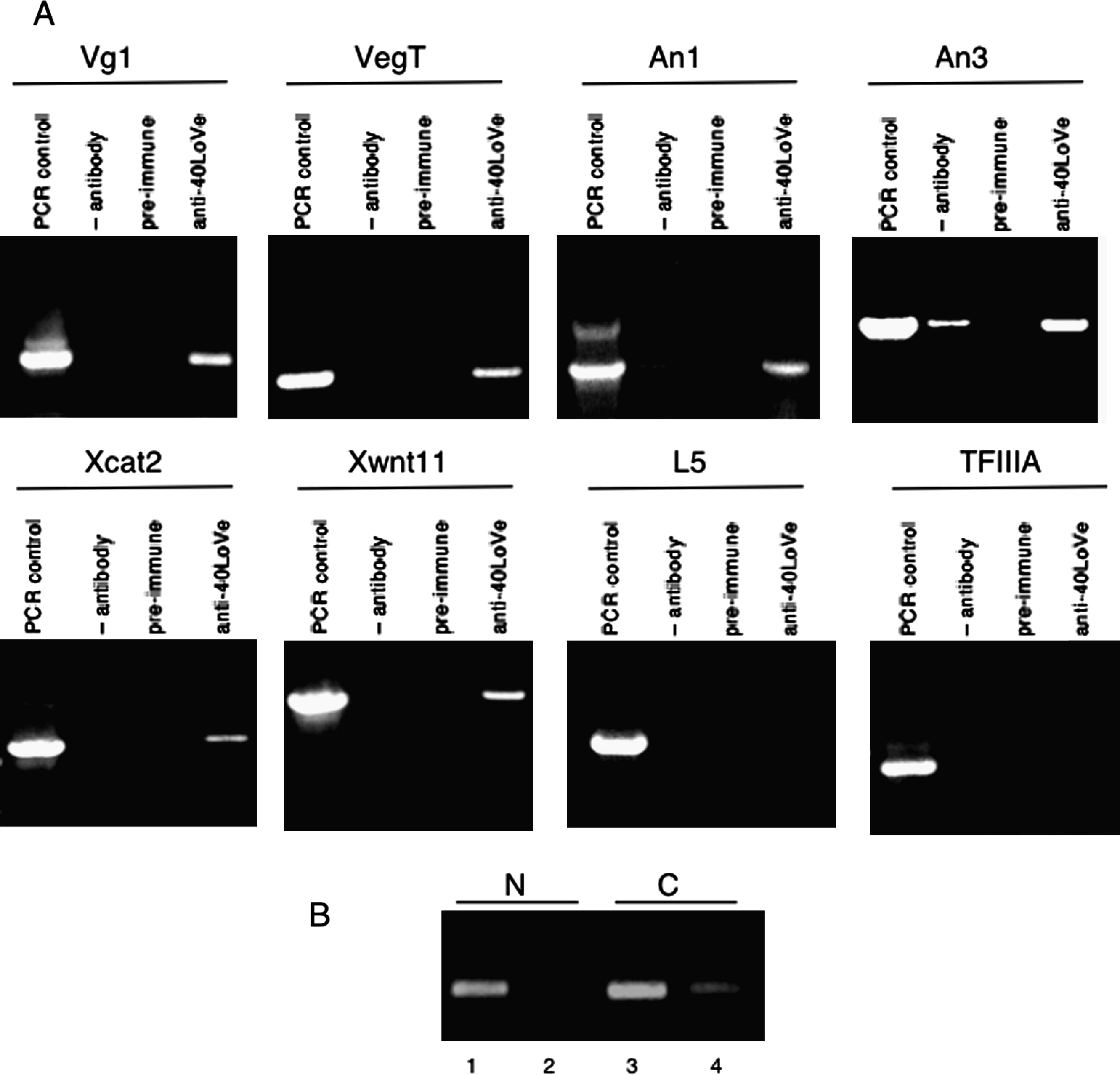 40LoVe is associated with localized RNAs in vivo. (A) 40LoVe was immunoprecipitated from whole cell extract prepared from stage III/IV oocytes. Associated RNA was reverse transcribed into cDNA and amplified by PCR using gene-specific primers (denoted by the bars above the relevant lanes) to test for the presence of the indicated mRNA. A standard was generated using total oocyte RNA as the template for RT-PCR (PCR control). Control assays included precipitation with protein A–Sepharose resin alone (–antibody) and resin adsorbed with pre-immune serum. (B) Stage II oocytes were manually separated into nuclear (N) and cytoplasmic (C) fractions. Extract from each was immunoprecipitated with protein A–Sepharose resin absorbed with affinity-purified antibody to 40LoVe (lanes 1 and 3) or preimmune serum (lanes 2 and 4). The presence of Vg1 mRNA was detected by RT-PCR.
