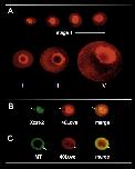 Distribution of 40LoVe during oogenesis. (A) Staged albino oocytes were fixed, incubated with an affinity purified antibody against 40LoVe, and visualized (10× objective) using a secondary antibody conjugated to AlexaFluor-568. The oocytes are orientated with the animal pole at the upper right. (B) Stage I oocytes were used for whole-mount in situ hybridization with an antisense Xcat-2 RNA probe labeled with AlexaFluor-488-5-UTP. This was followed by immunocytochemical analysis with 40LoVe antibody. An optical confocal section was viewed in the green channel (left) to detect Xcat-2 mRNA or in the red channel (middle) to detect 40LoVe. A merge of the two images (right) demonstrates that the cytoplasmic Xcat-2 mRNA (mitochondrial cloud) is in the region from which 40LoVe is excluded. (C) Immunocytochemistry was used to label the distribution of 40LoVe in stage I oocytes, followed by staining with MitoTracker Green (MT), which stains mitochondria. The mitochondria were viewed in the green (left) and 40LoVe in the red (middle) channels, respectively. The merged image (right) shows that 40LoVe is excluded from the mitochondrial cloud.