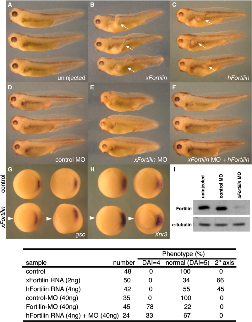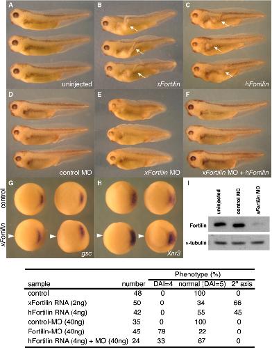 Fortilin overexpression enhances, but fortilin deficiency retards, the head development in Xenopus. The overexpressions of Xenopus (xFortilin) and human (hFortilin) fortilin induced the partial secondary body axis indicated by arrows (B and C) but not the ectopic expressions of goosecoid (gsc) and Xnr3 indicated by arrow heads (G and H). Controls are shown in A. Fortilin RNA was injected into the ventral marginal zone of four-cell stage embryos, and the phenotype was observed at stage 35 or whole mount in situ hybridization was performed using stage 10 embryos. Fortilin MO inhibited the head formation (E) and this phenotype was rescued by co-injection with human fortilin (F). MO was injected into the ventral marginal zone of four-cell stage embryos and control MO was used as a negative control. Table showed the summary of injection experiments. Fortilin MO partially depleted endogenous Xenopus fortilin protein in stage 10 embryos (I). DAI, dorsoanterior index.