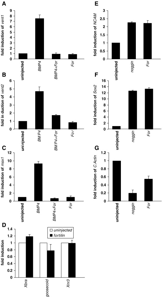 Fortilin is a BMP4 inhibitor in Xenopus development. In the animal cap assay, Xenopus fortilin (xFortilin) inhibited the expression of direct targets of BMP signaling, Vent1, Vent2 and Msx1 (A–C), and induced the expression of neural markers, NCAM and Sox2 (E, F). In addition, other markers, Xbra, goosecoid, Xnr3 and cardiac actin (D and G), were not induced by xFortilin. The gene expression was tested by quantitative real time RT-PCR at stage 10 (A–D) and stage 18 (E–G), and ODC (ornithine decarboxylase) expression was used to normalize the samples. Noggin was used as a positive control of a BMP inhibitor. The same experiments were performed three times, the means of which are depicted along with standard deviations (SDs).