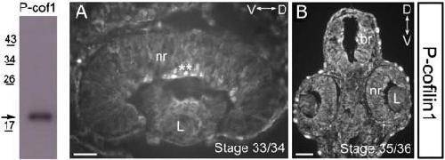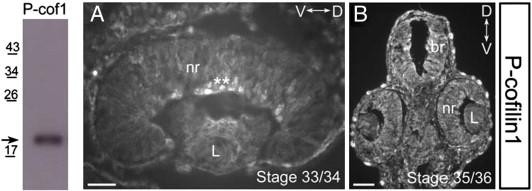 Fig. 3. P-cofilin1 is expressed by RGCs. In the top left is a Western blot of protein isolated from stage 37/38 embryos, labelled with an antibody that recognizes P-cofilin1. The antibody recognizes a band at approximately 21 kDa (black arrow). (A, B) Transverse cryosections of Xenopus embryos immunolabelled with the P-cofilin1 antibody. P-cofilin1 is expressed in the retina at stage 33/34, particularly in a subset of cells in the GCL (; A). In a lower power view of a labelled section through the eyes and brain of a stage 35/36 embryo, we can see that Pcofilin1 is expressed throughout the embryo, but at variable levels (B). Scale bar is 50 μm in A for A. Scale bar in B is 25 μm. br, brain; D, dorsal; L, lens; nr, neural retina; V, ventral. |