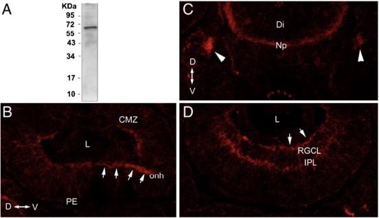 Fig. 2. LIMK is active in developing RGCs and their processes. (A) The P-LIMK antibody detects the phosphorylated, active forms of LIMK1/2 with the molecular weight of  65 kDa. (BâD) Transverse cryosections were immunolabelled with the antibody, and stacked optical slices presented. At stage 33/34, there is label in RGC axons, shown in a section (B) where RGC axons run along the vitreal surface of the retina (arrows) and in the optic nerve head, and in a section (C) that has captured part of the bilateral optic nerves before they enter the ventral diencephalon (white arrowheads). Labelling of the brain neuropil is also evident. At stage 37/38 (D), the optic fiber layer expression is still present (white arrows), but there is now more obvious labelling of the IPL. cmz, ciliary marginal zone; Di, diencephalon; D, dorsal; IPL, inner plexiform layer; L, lens; onh, optic nerve head; PE, pigment epithelium; RGCL, retinal ganglion cell layer; V, ventral. |