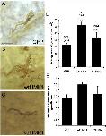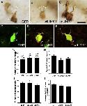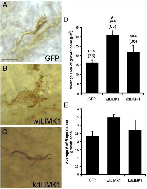 Fig. 7. wtLIMK1 overexpressing growth cones are larger than control. (AâC) Growth cones of transgene-expressing RGC axons labelled with α-GFP (A) or α-myc (B, C) antibodies in stage 40 Xenopus brains. CS2-GFP, CS2-wtLIMK1-MT or CS2-kdLIMK1-MT was electroporated into the developing retinas of stage 27 embryos, which were fixed at stage 40, dissected and processed for wholemount immunochemistry. The growth cones photographed and analyzed are those that failed to reach the tectum. Scale bar in A is 10 μm for AâC. (D) Graph showing the average area of the growth cones present at the tips of GFP, wtLIMK1-MT, or kdLIMK1-MT-expressing axons that fail to reach the tectum. n = the number of independent experiments, and in brackets are the numbers of growth cones analyzed. Error bars are S.E.M. p < 0.05, One Way ANOVA, StudentâNewmanâKeuls post hoc test. (E) Graph showing the average number of filopodia extended from growth cones expressing wtLIMK1-MT, dnLIMK1-MT or GFP. n's are the same as for A. Error bars are S.E.M. There is no statistical difference between the three groups. p > 0.05, One Way ANOVA. |