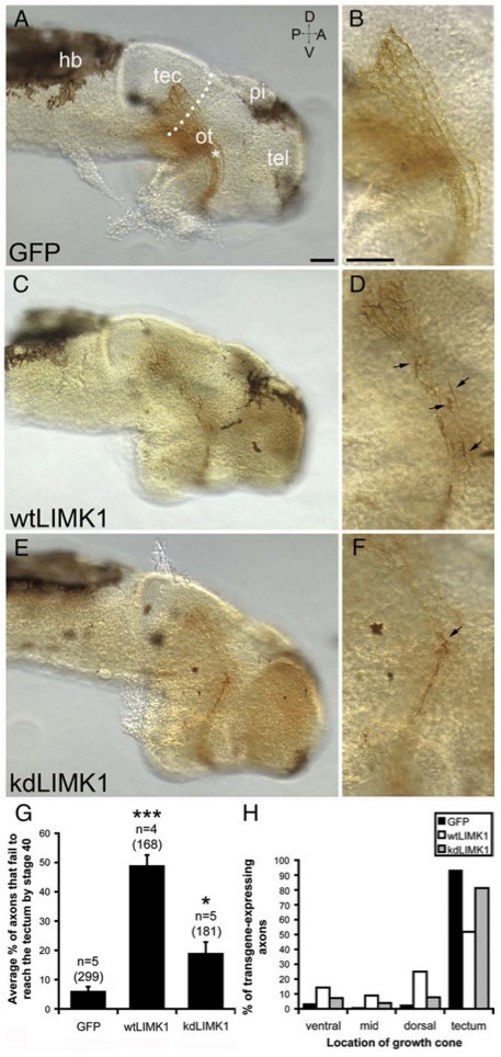 Fig. 6. Altered LIMK1 activity prevents RGC axons from reaching their target. (A) Lateral views of stage 40 wholemount Xenopus brains showing RGC axons labelled with α-GFP (A, B) or α-myc antibodies (C). The developing retinas of stage 27 Xenopus embryos were electroporated with plasmids encoding CS2-GFP alone (A, B), CS2-GFP plus CS2-wtLIMK1-MT (C, D) or CS2-GFP plus CS2-kdLIMK1-MT (E, F). Embryos were fixed at stage 40 and their brains processed for wholemount immunochemistry. B, D, and F are higher magnification views of the tracts shown in A, C, and E, respectively. (A, B) The vast majority of RGC axons expressing GFP alone have grown through the diencephalon, made a caudal turn in the mid-diencephalon (â) and innervated the optic tectum by stage 40 (dotted line shows the approximate anterior border of the optic tectum). (C, D) Many of the axons expressing wtLIMK1-MT fail to reach their target by stage 40, and their growth cones (arrows) can be detected at various locations within the optic tract. (E, F) Some of the kdLIMK1-expressing axons also fail to reach the tectum (arrow; F). Scale bar in A is 50 μm for A, C, E. Scale bar in B is 50 μm for B, D, F. A, anterior; D, dorsal; hb, hindbrain; pi, pineal gland; P, Posterior; ot, optic tract; tec, tectum; tel, telencephalon; V, ventral. (G) Graph showing the percentage of transgene-expressing axons that fail to reach the tectum by stage 40. n=the number of independent experiments, and in brackets are the numbers of axons analyzed. Error bars are S.E.M. âââpb0.001, One Way ANOVA, Studentewmaneuls post hoc test. (H) Graph showing the locations of the growth cones for the GFP, wtLIMK1-MT or kdLIMK1-MT-expressing axons. Growth cones were categorized as being in the ventral diencephalon, mid-diencephalon, or dorsal diencephalon, and then graphed as the percentage of the total number of expressing axons, including those that reached the tectum, which were found in each region. n's are the same as in G. |