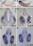 Fig. 1. Expression of limk1 in the developing Xenopus retina. (AâF) Xenopus embryos processed for wholemount in situ hybridization using antisense RNA probe for limk1. Whole embryos show a restricted pattern of limk1 expression. The eye, otic vesicle, areas of the brain and the nasal placodes all express limk1 mRNA at stage 30 (A). The pattern is maintained, but stronger in the eye and brain, at stage 35/36 (B). Transverse vibratome sections through labelled embryos shows the changing pattern of limk1 in the retina. At stage 28, the optic vesicle has not yet invaginated and there is a patch of limk1 expression in the dorsal/central retina that spans the width of the tissue (C). By stage 30, the optic cup is present and limk1 is expressed in the inner layers that will become the GCL () and the inner nuclear layer (INL) (not labelled) (D). Expression has spread to the dorsal ciliary marginal zone (CMZ; white arrowhead), but is still absent from the ventral CMZ (black arrowhead). Expression in the central retina has weakened slightly at stage 33/34 (E), while the dorsal CMZ, ventral retina and ventral CMZ show robust expression. The divisions between the emerging layers are shown by the white lines in E (from lens outward is GCL, INL, ONL). limk1 expression in RGCs begins to decrease at stage 35/36 (F), but is still strong in the INL and CMZ. A, anterior; br, brain; D, dorsal; e, eye; np, nasal placodes; nr, neural retina; ot, otic vesicle; P, posterior; V, ventral. Scale bar in C is 50 μm. |