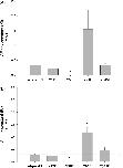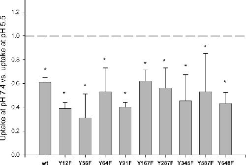 Fig. 2. Comparison of pH dependence of [3H]-d-Phe-l-Gln uptake by the wild-type rPepT1 (wt) and individual tyrosine mutants. Uptake of [3H]-d-Phe-l-Gln by oocytes was measured at extracellular pH 5.5 and pH 7.4 after one hour incubation. Values represent mean ± SEM for three separate oocyte preparations and are normalized to the uptake at pHout 5.5 for each construct, *p < 0.01, n = 3, Student's t-test compared to pHout 7.4.