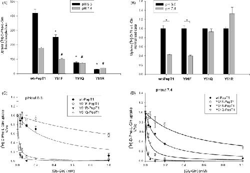 Fig. 6. (A) Uptake of [3H]-d-Phe-l-Gln in Xenopus oocytes expressing wild-type rPepT1 (wt-PepT1), Y91F-, Y91Q- or Y91R-PepT1. *p < 0.05 versus wild-type uptake at pHout 5.5 (black bars) and #p < 0.05 versus wild-type uptake at pHout 7.4 (grey bars), Student's t-test, n = 3). (B) pH dependence of [3H]-d-Phe-l-Gln uptake normalised to the uptake of pHout 5.5 for each construct. pH dependence of uptake is maintained only in the Y91F-rPepT1 mutant (*p < 0.01, Student's t-test, n = 3). (C and D) Ki determination of Gly-l-Gln against 0.4 μM [3H]-d-Phe-l-Gln uptake by wild-type rPepT1 (wt-PepT1) and the Y91F-, Y91Q- and Y91R-rPepT1 mutants at pHout 5.5 (C) and 7.4 (D). Lines represent best fit of the data to Michaelis–Menten kinetics for binding to a single site (Deves and Boyd, 1989). Each data point is the mean ± SEM of 5 oocytes, and the graphs are representative of n ≥ 2 oocyte preparations.