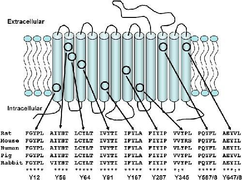 Fig. 8. Cartoon representation of rPepT1 to show the putative position of the transmembrane tyrosines (adapted from Fei et al., 1994).