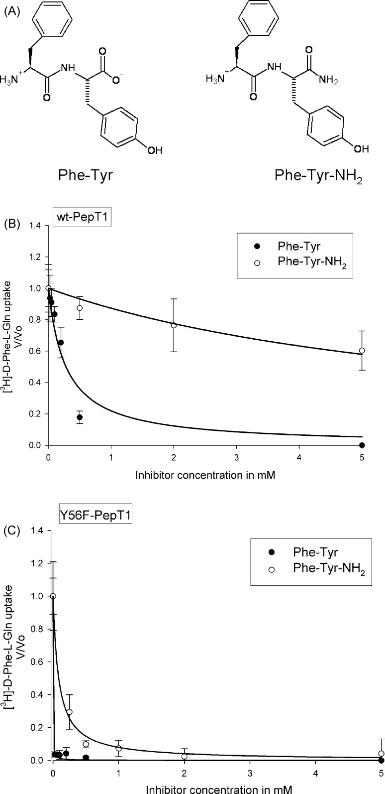 Fig. 4. (A) Chemical structures of Phe-Tyr-NH2 and its parent compound Phe-Tyr. (B and C) Ki determination of carboxyl-terminal amidated Phe-Tyr-NH2 and the parent compound Phe-Tyr by wild-type-PepT1 (B) and Y56F-rPepT1 mutant (C) at pHout 5.5. Uptake of 0.4 μM [3H]-d-Phe-l-Gln into oocytes was measured in the presence of increasing concentrations of Phe-Tyr or Phe-Tyr-NH2 at pHout 5.5. Lines represent best fit of the data to Michaelis–Menten kinetics for binding to a single site (Deves and Boyd, 1989). Each data point is the mean ± SEM of 5 oocytes, and the graphs are representative of n = 4 oocyte preparations.