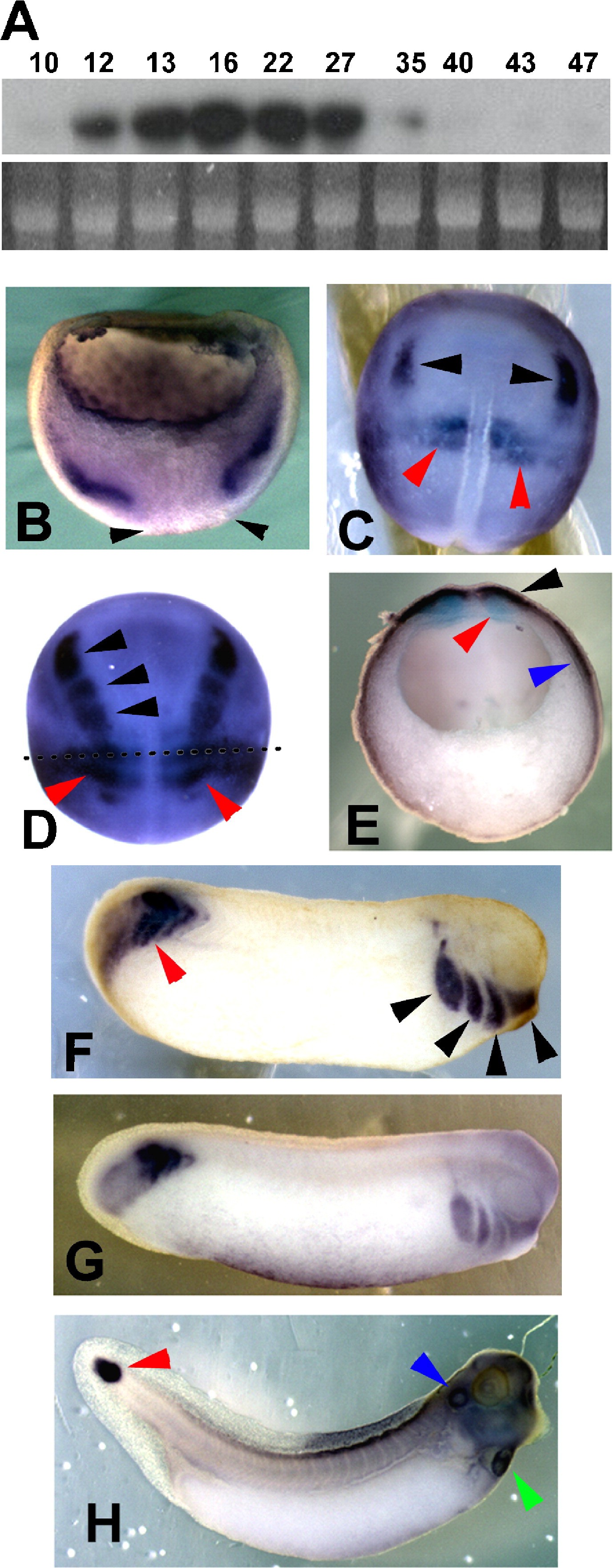 Fig. 2. PCNS expression in Xenopus embryos. (A) Developmental northern showing the temporal expression of PCNS. Xenopus embryo stages (Nieuwkoop and Faber, 1994) are indicated above the lanes. Strong expression is observed from late gastrula (stage 12) until late tailbud (stage 27) after which PCNS mRNA declines to background level. The gel was stained with ethidium bromide to assure equal loading of lanes. (B) Sagittal section of a mid-gastrulaembryo (stage 11), showing expression in the deep mesodermal cells. Animal pole at the top, dorsal on the right. The edges of the blastopore are indicated with arrowheads. (C) Expression in the CNC (black arrowheads) and somites (red arrowheads) in an early neurula stageembryo (stage 14). (D) Individual domains of CNC expression corresponding to prospective pharyngeal arches (black arrowheads) and a more posterior set of somites (red arrowheads) in late neurula stageembryo (stage 17). (E) Transverse section of embryo in panel D (plane indicated by dashed line) showing expression in the somite (red arrowhead), trunkNC (black arrowhead) and lateral plate mesoderm (blue arrowhead). Note that the color differences are an artifact of BM Purple staining. (F) Tailbudembryo (stage 25) expression in pharyngeal arches (black arrowheads) and posterior band of somites (red arrowhead). Anterior is to the right. (G) Stage 31embryo; pharyngeal arch expression has begun to fade as somite bands proceed further to the posterior. (H) Early tadpole (stage 34) somite expression exclusively at the most posterior tip of the tail (red arrowhead). PCNS RNA now detected in otic vesicle (blue arrowhead) and heart anlage (green arrowhead).