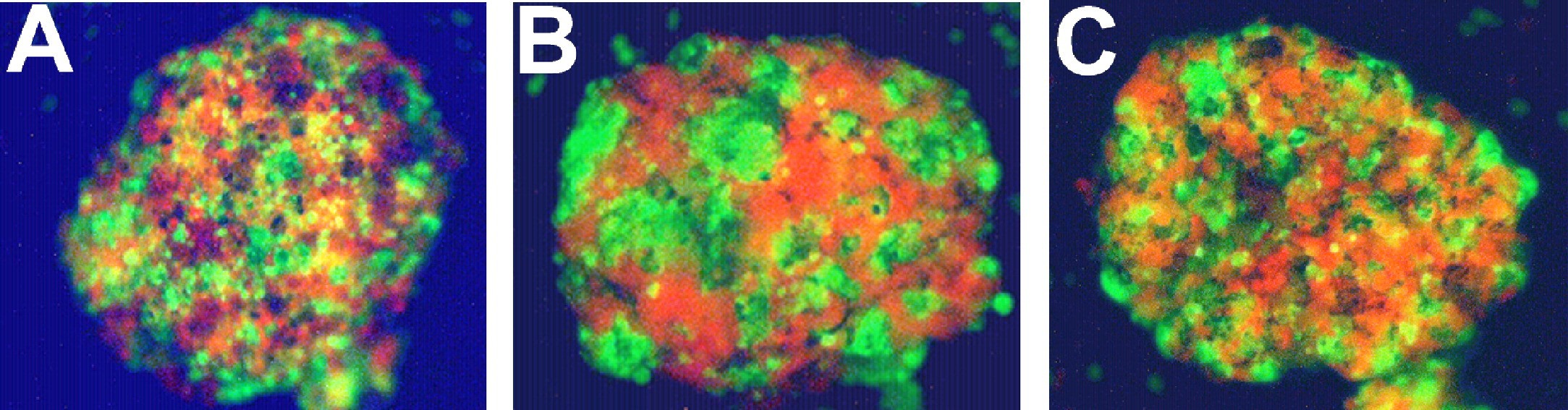 Fig. 4. Dissociation and reaggregation assay. Dissociated inner ectodermal cells from embryos injected with 15 ng of RDx were mixed with inner ectodermal cells from embryos injected with RNAs encoding eGFP (panel A) or eGFP and PAPC (panel B) or eGFP and PCNS (panel C). Reaggregated cells were cultured until sibling embryos reached stage 28. PCNS expression yielded essentially the same degree of segregation as eGFP alone, while PAPC-expressing cells (green) largely separated from non-expressing cells (red). Each sample replicated in quadruplicate with similar results.
