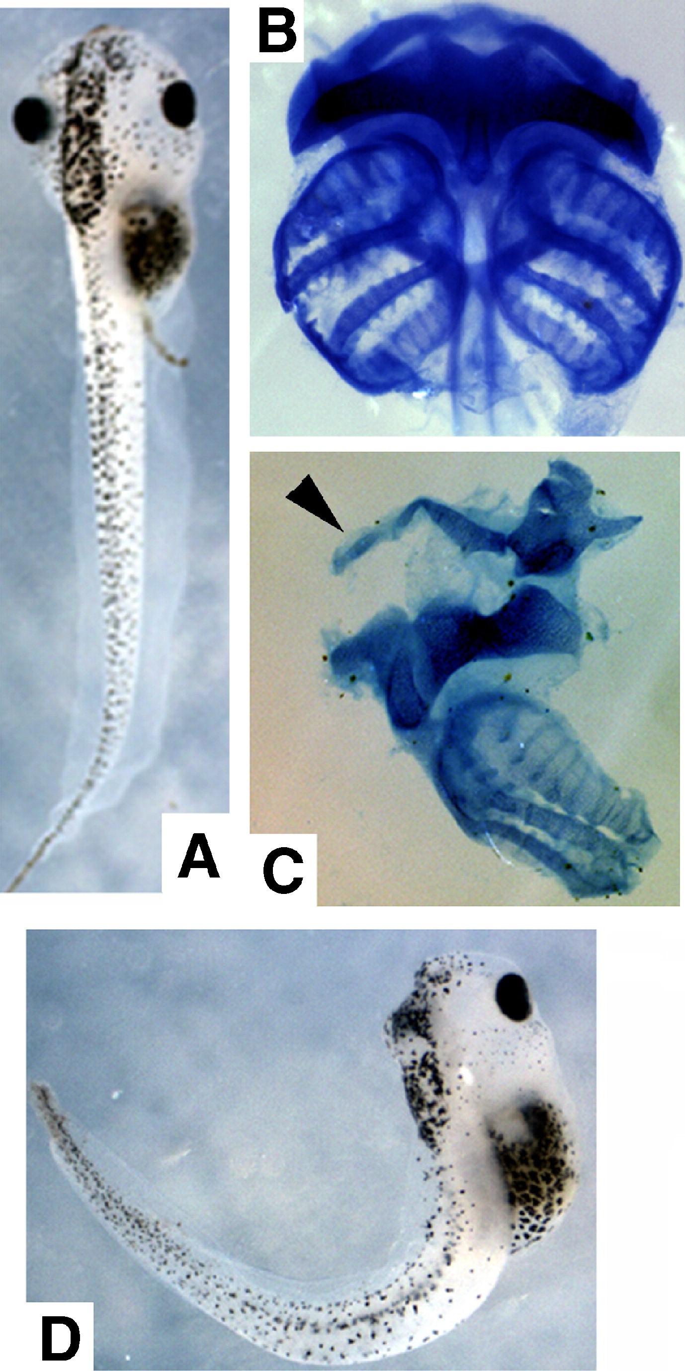 Fig. 6. Craniofacial phenotype in tadpoles (stage 44). Embryos injected with 25 ng Co (A, B) or M1 (C, D) into one blastomere at the two-cell stage. The injected side is on the left in each panel. (A) Embryos injected with Co were normal overall (100%, n = 17) and had normal cranial cartilage as visualized with Alcian blue staining (panel B). (D) M1 resulted in cranial hypoplasia on the injected side in addition to a curved tail (87%, n = 15) and virtually complete loss of cranial cartilage, especially more posterior elements and gills. Some Meckel's cartilage was retained (arrowhead, panel C).