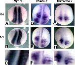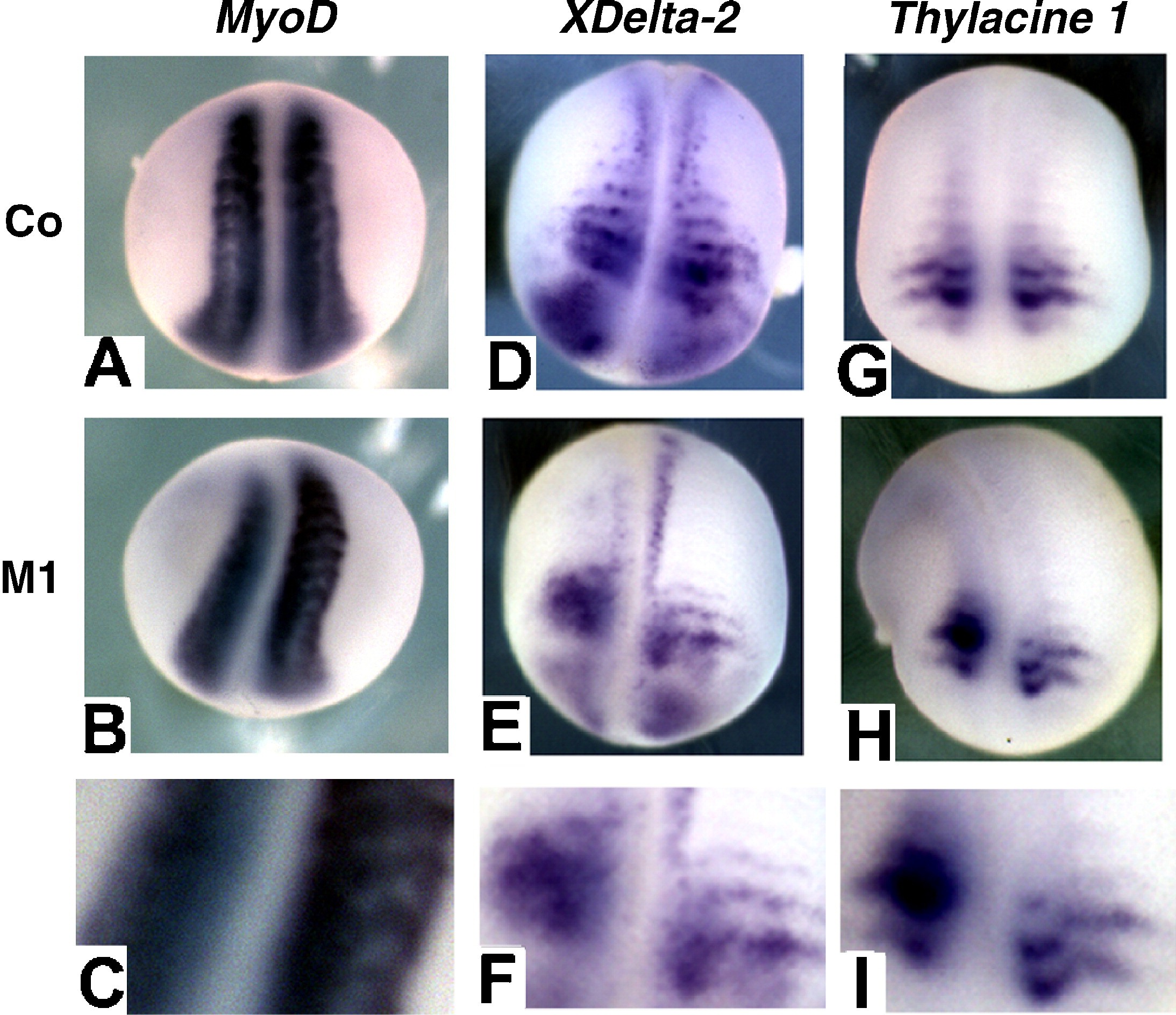 Fig. 8. Impaired somitogenesis in M1-injected embryos. (A) Whole-mount in situ hybridizations with MyoD (A), X-Delta-2 (D) or Thylacine 1 (G) to stage 20 (A) or stage 21 (D) embryos injected with 25 ng of Co or M1 into one cell at the two-cell stage. Injection of M1 inhibited somite segmentation for MyoD (panel B; 100%, n = 15) X-Delta-2 (panel E; 54%, n = 28) and Thylacine 1 (panel H; 53%, n = 15). Magnified images of somites in M1 embryos are shown in separate panels for MyoD (C), X-Delta-2 (F) and Thylacine 1 (I). Injection of Co had no effect (100% for MyoD, n = 29; 100%, n = 25 for X-Delta-2; 100%, n = 15 for Thylacine 1; panels A, D and G, respectively). All panels show dorsal view of embryos with anterior to the top and the injected side to the left.