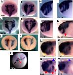 Fig. 5. PCNS loss of function. Whole-mount in situ hybridizations with NC markers to stage 19 (A), stage 22 (H) or stage 31 (L) embryos injected into one cell at the two-cell stage with 25 ng of M1 (B, D, G, K, O) or Co (A, C, I, M), or into one cell at the eight-cell stage with 6 ng of M1 (F) or Co (E), along with lacZ RNA as a lineage tracer. In situ probes are indicated on the individual panels at lower left. In each case, M1 resulted in severe inhibition of CNC cell migration into pharyngeal arches, and Co had no effect. In panels E and F, the lineage tracer is visible as red staining on the left side of the embryos. M1 injection inhibited migration of NC from rhombomere 5 (G; black arrowhead) without affecting the neural tube expression (red arrowhead). Panels A are dorsal views with the injected side on the left. In some cases, images were flipped horizontally to maintain this orientation. In panels H, the uninjected sides are shown on the left (H, J, L, N) and injected sides on the right (I, K, M, O). Images have been flipped horizontally to facilitate comparison of injected and uninjected sides. M1 strongly inhibited migration into posterior pharyngeal arches at stage 22 but had less effect on the mandibular arch migration (K; red arrowhead). Injection of Co had no effect (I). By stage 31 (L), Sox 9 expression in pharyngeal arches (N; red arrowheads) was essentially undetectable on the M1-injected side (O). Expression of Sox 9 in the otic vesicle was also strongly reduced (O; blue arrowhead). Injection of Co had no effect (M). Result statistics are summarized in Table 1.