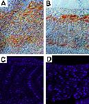 Fig. 9. Parasagittal sections of a stage 24 embryo injected in one cell at two-cell stage with 25 ng M1. Immunostaining with 12/101, a muscle-specific antibody to section of (A) uninjected and (B) M1-injected side shows disturbed somite morphology. DAPI staining of (C) uninjected and (D) injected side sections shows that cell orientation is also disrupted.