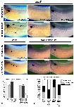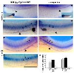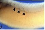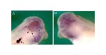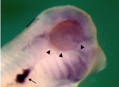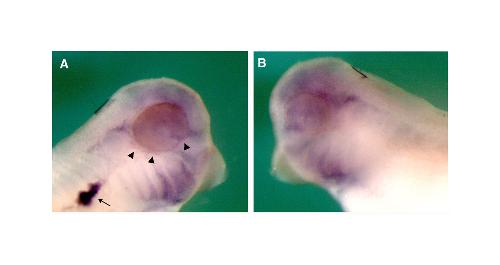 Fig. S1. Periocular vascular structures are disrupted and show decreased staining for dab2 following morpholino knockdown of FRG1. Control side (A) and injected side (B) of a stage 34 embryo injected with 40 ng of FMO1. Decreased dab2 in the ocular region was found in 88% (n=18) of embryos injected with 40 ng of FMO1. Arrowheads point to dab2-expressing vessels in the ventral side of the eye and at the optic fissure, which are not present on the injected side. The arrow points to the pronephric sinus, which has been stained for dab2; the pronephric sinus cannot be detected on the injected side.