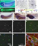 Fig. 1. Expression of the FRG1 protein during development. (A) Stage 36 whole-mount immunostaining shows the ubiquitous appearance of the FRG1 protein. FRG1-immunostained tadpoles were then sectioned either sagitally (B) or transversally (C) in the regions depicted in A. (D) Diagram of the minimal frg1 regulatory element (FRE) construct that was used to examine tissues with active transcription. EGFP expression was observed in stage 32 transgenic animals by both whole-mount fluorescence (E) and egfp in situ hybridization (F). By stage 36, transgenic egfp expression becomes restricted to muscle and vascular cell lineages (G), and by stage 42 it is observed almost exclusively within the vasculature (H). In adult X. laevis, immunostaining of FRG1 [green (I,K)] is observed in the gastrocnemius muscle, where it colocalizes precisely with rhodamine-labled lectin [red (J,K)], a marker for capillaries. Antibody specificity for the FRG1 peptide in these immunohistology experiments was confirmed by immunostaining with (M), or without (L), FRG1 peptide competition. (N) Strong FRG1 staining (red) was observed in arteries and veins in gastrocnemious sections co-stained with wheat germ agglutinin (green) and DAPI (blue). Abbreviations: ps, pronephric sinus; pd, pronephric duct; pcv, posterior cardinal vein; pda, paired dorsal arteries; nc, notochord; nt, neural tube; aa, aortic arches; ov, ophthalmic vessel; da, dorsal artery; dlav, dorsal lateralvein. Bars, 1 mm (A,EâH); 30 μm (B,C); 50 μm (KâN).