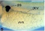 Fig. 2. Depletion of FRG1 inhibits vascular development. The mild (A) and severe (B) phenotypes of the FMO1-injected (40 ng) embryos show a reduction in vascular structures compared with the uninjected sides of the same embryos (D,E), as visualized by dab2 expression. (C,F) CMO-injected and uninjected sides of the same embryo, respectively. (G,J) FMO1-injected (40 ng) and uninjected sides of the same embryo, stained for msr. The arrowheads point to intersomitic veins. (H,I) Partial and full rescue of dab2 staining by co-injection with 40 ng of FMO1 and 500 pg of X. tropicalis frg1 mRNA. Co-injection of 40 ng of FMO1 with 1 ng of X. tropicalis frg1 mRNA was lethal. (M) The percentage of injected embryos displaying loss of dab2 and msr staining. (N) The percentage of embryos rescued by co-injection of FMO1 with frg1 mRNA. The numbers above the bars indicate the total number of embryos analyzed. Abbreviations: ps, pronephric sinus; vvn, vitelline vein network; pcv, posterior cardinal vein. Bars, 0.5 mm.