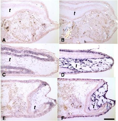 Fig. 4. The IFABP-TRDN-GFP transgene specifically inhibits TH direct-response genes in the epithelium, but not in the mesenchyme. Cross sections of duodenums from (A, B) wild-type NF54 tadpoles treated with either 0 nM T3; (C, D) 5 nM T3 for 48 h. Cross sections of duodenums from (E, F) sibling tadpoles transgenic for IFABP-TRDN-GFP treated with 5 nM T3 for 48 h. (A, C, E) Expression of the TH direct-response gene, bZip, mRNA in the epithelium. (B, D, F) Expression of the TH direct-response gene, stromelysin-3 (ST3), mRNA in the mesenchyme. mRNA localized by in situ hybridization (purple stain). Scale bar in F denotes 0.2 mm length.