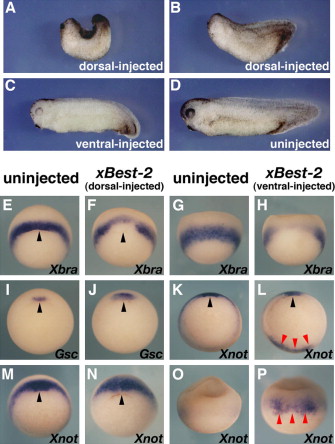Overexpression of xBest-2 causes gastrulation defect and interferes with the expression of mesendoderm genes. (A–C) Embryos were injected with 1 ng of xBest-2 RNA into the dorsal side (A, B) or the ventral side (C) at the 4-cell stage, and photographed at stage 35. (D) Uninjected control embryo at stage 35. (E–P) Embryos were injected with 1 ng of xBest-2 RNA into two dorsal (E, F, I, J, M, N) or two ventral (G, H, K, L, O, P) blastomeres at the 4-cell stage, and fixed at stage 10.5 for in situ hybridization analysis. Embryos are in dorsal view (E, F, M, N), ventral view (G, H, O, P), and vegetal view (I, J, K, L). (E–H) In situ hybridization of Xbra. (I, J) In situ hybridization of goosecoid (gsc). (K–P) In situ hybridization of Xnot. Black arrowheads indicate the blastopore lip. Red arrowheads indicate ectopic expression of Xnot. |