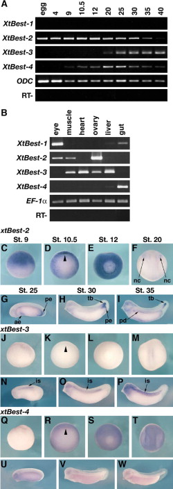 Comparison of X. tropicalis Best gene expression patterns. (A) Temporal expressions of X. tropicalis Best genes. RNA was extracted from X. tropicalis embryos at the stages indicated above each lane. egg, Unfertilized egg; RT-, RT-PCR without reverse transcriptase in ODC reaction. (B) Expression profile of Best genes in X. tropicalis adult tissues. RNA was extracted from X. tropicalis embryos at the stages indicated above each lane. egg, Unfertilized egg; RT-, RT-PCR without reverse transcriptase in EF-1 a reaction. (CâW) Spatial expression pattern of X. tropicalis Best genes analyzed by in situ hybridization. (C, J, Q) Stage 9 embryos in lateral view. (D, K, R) Stage 10.5 embryos in vegetal view. Arrowheads indicate the blastopore lip. (E, L, S) Stage 12 embryos in vegetal view. (F, M, T) Stage 20 embryos in dorsal view. (G, N, U) Stage 25 embryos. (H, O, V) Stage 30 embryos. (I, P, W) Stage 35 embryos. nc, neural crest; ae, anterior endoderm; pe, posterior endoderm; tb, tailbud; pd, pronephric duct; is, intersomatic tissue.