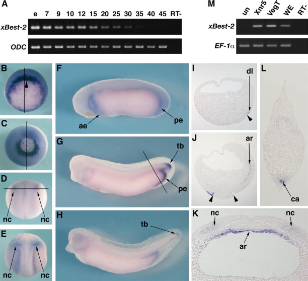 Conserved expression of Xenopus Best-2 gene in the organizer and blastopore lip. (A) Temporal expression of X. laevis Best-2 gene. RNA was extracted from X. laevis embryos at the stages indicated above each lane. egg, unfertilized egg; RT-, RT-PCR without reverse transcriptase. (BâJ) Spatial expression of X. laevis Best-2 analyzed by in situ hybridization. (B) Stage 10.5 embryo in vegetal view. Arrowhead indicates the blastopore. The line represents the position of the section shown in (I). (C) Stage 12 embryo in vegetal view. The line represents the position of the section shown in (J). (D) Stage 15 embryo in dorsal view. The line represents the position of the section shown in (K). (E) Stage 20 embryo in dorsal view. (F) Stage 25 embryo. (G) Stage 30 embryo. The line represents the position of the section shown in (L). (H) Stage 35 embryo. (I) Sagittal section of a stage 10.5 embryo. The arrowhead indicates the blastopore. (J) Sagittal section of a stage 12 embryo. Arrowheads indicate the edge of the yolk plug. (K) Transverse section of a stage 15 embryo. (L) Transverse section of a stage 30 embryo. nc, neural crest; ae, anterior endoderm; pe, posterior endoderm; tb, tailbud; ar, archenteron roof; ca, cloaca. (M) xBest-2 is induced by nodal signaling. Animal caps were dissected from embryos injected with 20 pg of Xnr5 RNA or 500 pg of VegT RNA, and cultured until stage 20 for RT-PCR. Both Xnr5 and VegT induced expression of xBest-2. un, uninjected animal caps as a negative control; WE, whole embryo as a positive control; RT-, reverse transcriptase minus as a negative control. |