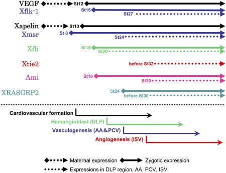 Figure 5. Temporal expression patterns of already-known genes that are related to blood vessel differentiation in Xenopus. Dashed arrows indicate the temporal expression of each gene in prospective and forming regions of the blood vessel, as follows: DLP, dorsal lateral plate; AA, aortic arches; PCV, posterior cardinal vein; ISV, intersomitic vein. The differentiation processes of blood vessel formation are indicated in the middle. The timing of definitive differentiation of the hemangioblast is not well understood, but it is known that the hemangioblasts located in the DLP differentiate into adult blood cells and vascular endothelial cells. Fli1 is known to be a marker of hemangioblasts (Liu et al.,2008). The start of vasculogenesis and angiogenesis is clearly observed as the expression of Xmsr in the AA or PCV and the expression of Xtie2 in the sprouting ISV, as determined by whole-mount in situ hybridization. We identify two novel potential marker genes, Ami and XRASGRP2, for the late differentiation of blood vessels, angiogenesis and/or maturation.Download figure to PowerPoint |