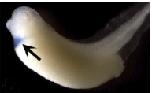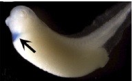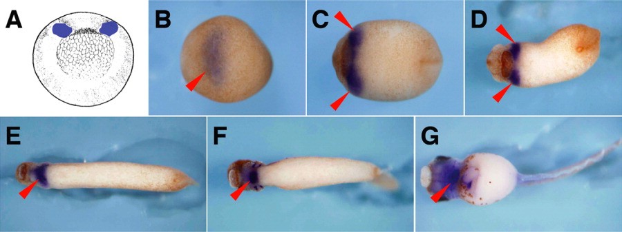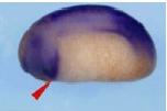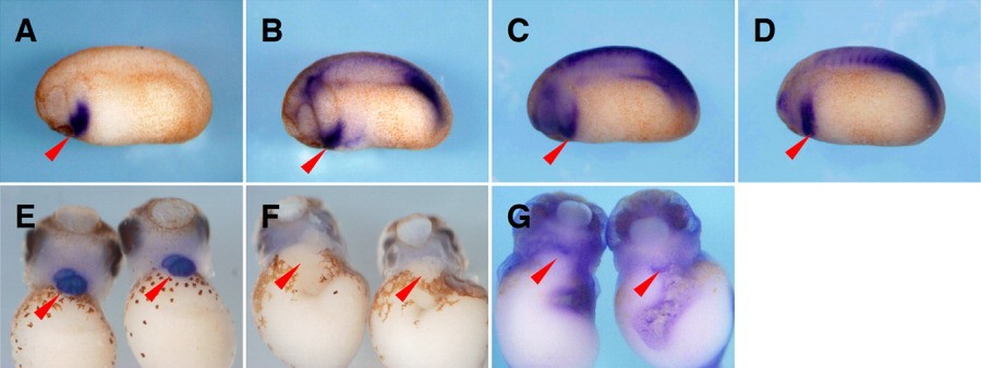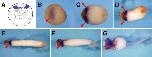 Figure 1. Cardiac formation during Xenopus early embryogenesis. A: Precardiac mesoderm (PCM, blue) is formed on the prospective dorsal side of the early gastrula (stage 10). B-G: The region of PCM formation is defined by the expression of Nkx2.5 (arrowhead; Tonissen et al.,[1994]). B: By the end of the gastrula (stage 13), the PCM is fused and lies at the anterior end of the embryo. C: At the neurula (stage 18), the PCM is located on the ventral side behind the cement gland. D: At the early tail bud (stage 23), the PCM is separated. At the mid-tail bud (stage 28), the PCM is re-fused. F: At the late tail bud (stage 34), a tubular and beating heart is formed. G: At this point, the tadpole heart separates into the atrium and ventricle. A: Vegetal view, with dorsal upward. B-G: Ventral view, with anterior toward the left. |