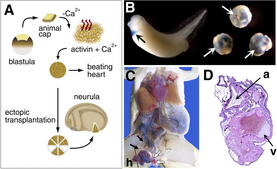 Figure 2. Cardiac induction from animal caps and in vivo transplantation. A: Animal caps excised from blastulae were placed in physiologic saline that lacked calcium, to loosen the cell adhesions. The culture medium was replaced with 100 ng/ml activin dissolved in physiologic saline that contained calcium, and the cells were dissociated by pipetting. Individual cells were then reaggregated, and the reaggregates began to beat approximately 2 days later. Reaggregates that had been cultured for 1 day were broken into appropriate sizes and transplanted through an incision that had already been made anterior to the cloaca in the neurula. B: XcTnI, a marker gene for myocardial differentiation, is expressed specifically in the myocardium of a normal 3-day-old embryo (left). The dissociated animal cap cells form spherical reaggregates, regardless of whether they have been treated with activin. XcTnI signals are detected exclusively in the activin-treated reaggregates (right). C: The internal anatomy of a 1-year-old frog with a well-developed ectopic heart. The ectopic heart adjacent to the host's intestine is incorporated into the host's vascular system. The blood from the host's mesenteric artery (black arrows) flows into the host's anterior abdominal vein (white arrows) by means of the ectopic heart (h). D: Histologic section of an ectopic heart. The heart can be divided into multiple chambers: a ventricle-like chamber (v) that comprises a thick and deeply penetrating layer of myocardium; and an atrium-like chamber (a) that is surrounded by a thin layer of myocardium. |