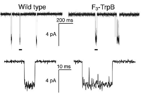 Figure 5. Single-channel recordings from wild type α4β2 (conventional expression) and the F3-Trp mutant (nonsense suppression) at site B, with nicotine applied at EC50 values (0.080 and 1.2 µM, respectively). Lower traces are expansions of the regions marked by a bar in the upper trace. Records were obtained in the cell-attached configuration with a pipette potential of +100 mV and are shown at 2 kHz bandwidth. Channel openings are shown as downward deflections.