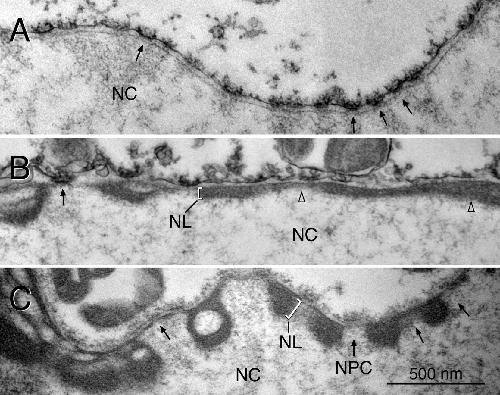 TEM of the NEs of lamin A-expressing oocytes. Prelamin A was expressed in oocytes by nuclear injection of plasmid. TEM sections of isolated oocyte nuclei are shown. The lamina (NL) (brackets in B and C) forms a thick electron-dense layer in oocytes expressing lamin A (B and C), which leaves the NPCs (arrows) free. The lamina in noninjected control oocytes is hardly discernible (A). NC: nuclear content; arrows point to NPCs; open triangles in B point to adjacent lamina layers of different thickness. Images were taken at the same magnification.